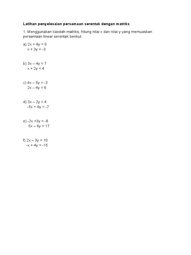Latihan penyelesaian persamaan linear pt3. Persamaan linear serentak dalam dua pemboleh ubah. Latih tubi ting 4 5 matematik. Sebelum ini ialah bab form 3. Matriks 4 8a penyelesaian persamaan linear serentak dengan kaedah matriks buku teks. Soalan matematik persamaan linear tingkatan 1 viral blog j.